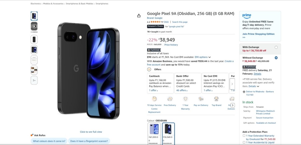 গুগল Pixel 9a এর 8GB + 256GB লঞ্চ প্রাইস ছিল 49,999 টাকা। বর্তমানে Obsidian ভ্যারিয়েন্ট টি প্রায় 38,949 টাকায় লিস্টেড, অর্থাৎ সরাসরি 11 হাজার টাকার বেশি ছাড়। সব অফার ঠিকভাবে ব্যবহার করলে কার্যকর দাম প্রায় 37,000 হাজার টাকার কাছাকাছি নেমে আসতে পারে।