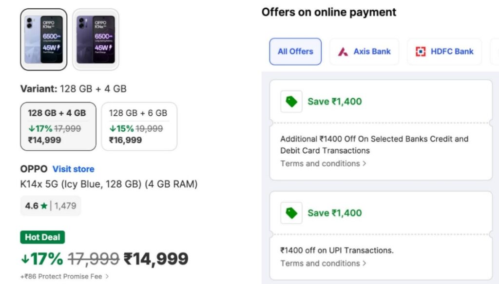 বর্তমানে Flipkart এ OPPO K14x 5G স্মার্টফোনে 1,400 টাকা পর্যন্ত ব্যাংক ডিসকাউন্ট দেওয়া হচ্ছে। ফলে 14,999 টাকার 4GB RAM ভ্যারিয়েন্ট এখন 13,599 টাকায় কেনা যাচ্ছে। অন্যদিকে 6GB RAM ভ্যারিয়েন্টটি 15,599 টাকায় উপলব্ধ। এই অফারের সুবিধা পেতে HDFC, ICICI, SBI, Axis, Kotak এবং Bank of Baroda এর ক্রেডিট বা ডেবিট কার্ড ব্যবহার করা যাবে। শুধু তাই নয়, BHIM, GPay, Paytm, PhonePe, CRED, Supermoney এবং Freecharge এর মতো UPI ও ডিজিটাল ওয়ালেট থেকেও পেমেন্ট করলে একই ডিসকাউন্ট পাওয়া যাবে।