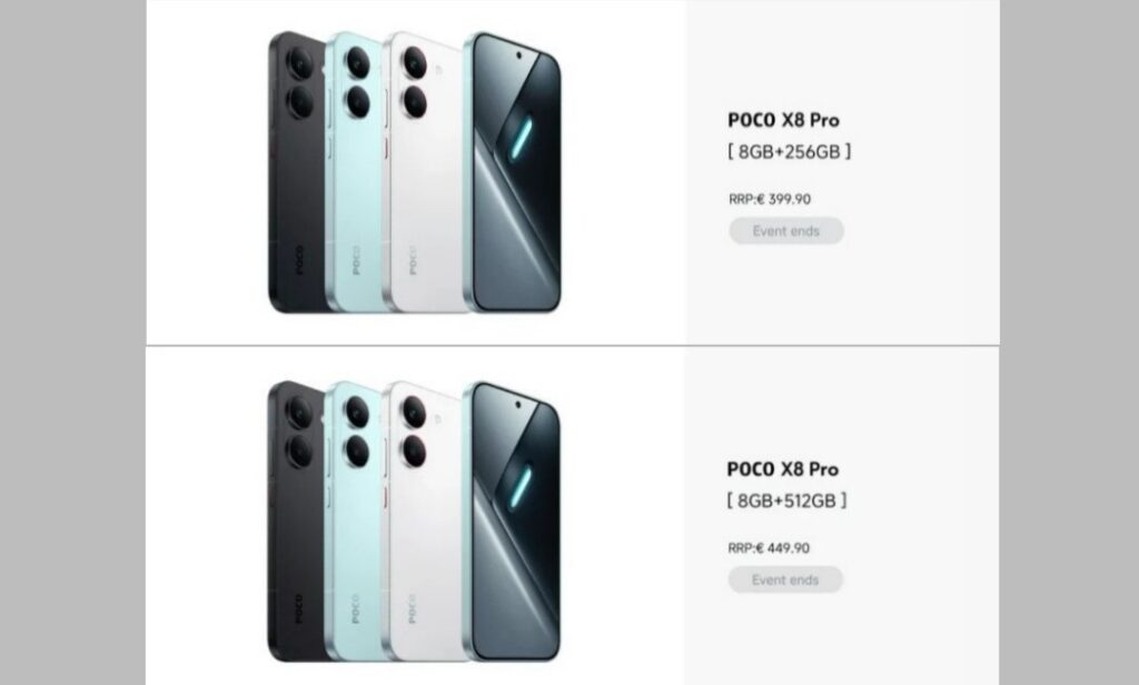 প্রোমোশনাল লিস্টিং অনুযায়ী Poco X8 Pro এর 8GB+256GB ভ্যারিয়েন্টের দাম প্রায় €399.90, যা ভারতীয় টাকায় প্রায় 42,700 হাজার টাকা। 8GB+512GB ভ্যারিয়েন্ট €449.90, প্রায় 48,100 হাজার এবং 12GB+512GB মডেল €479.90, যা ভারতে প্রায় 51,300। Poco X8 Pro Max এর 12GB+256GB ভ্যারিয়েন্টের দাম €529.90, ভারতের টাকায় প্রায় 56,600 এবং 12GB+512GB ভ্যারিয়েন্ট €579.90, যা ভারতীয় টাকায় প্রায় 62,000 হাজার টাকা হিসেবে তালিকাভুক্ত হয়েছে। অফিসিয়াল লঞ্চের সময় চূড়ান্ত দাম নিশ্চিত হবে।
